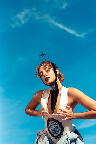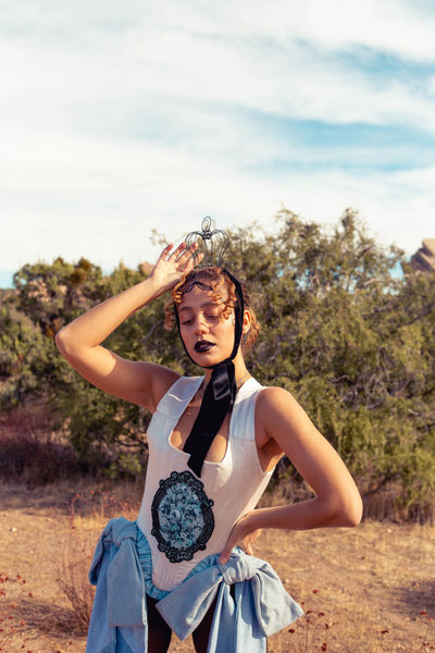 Gorgeous white silk corset available for rent featuring a hand-embroidered and painted patch. Made from a combination of dead stock/vintage fabric, and up-cycled clothing. The Nathalia features a frame made with a sparkly vintage black thread from the 1950’s-60s.Â